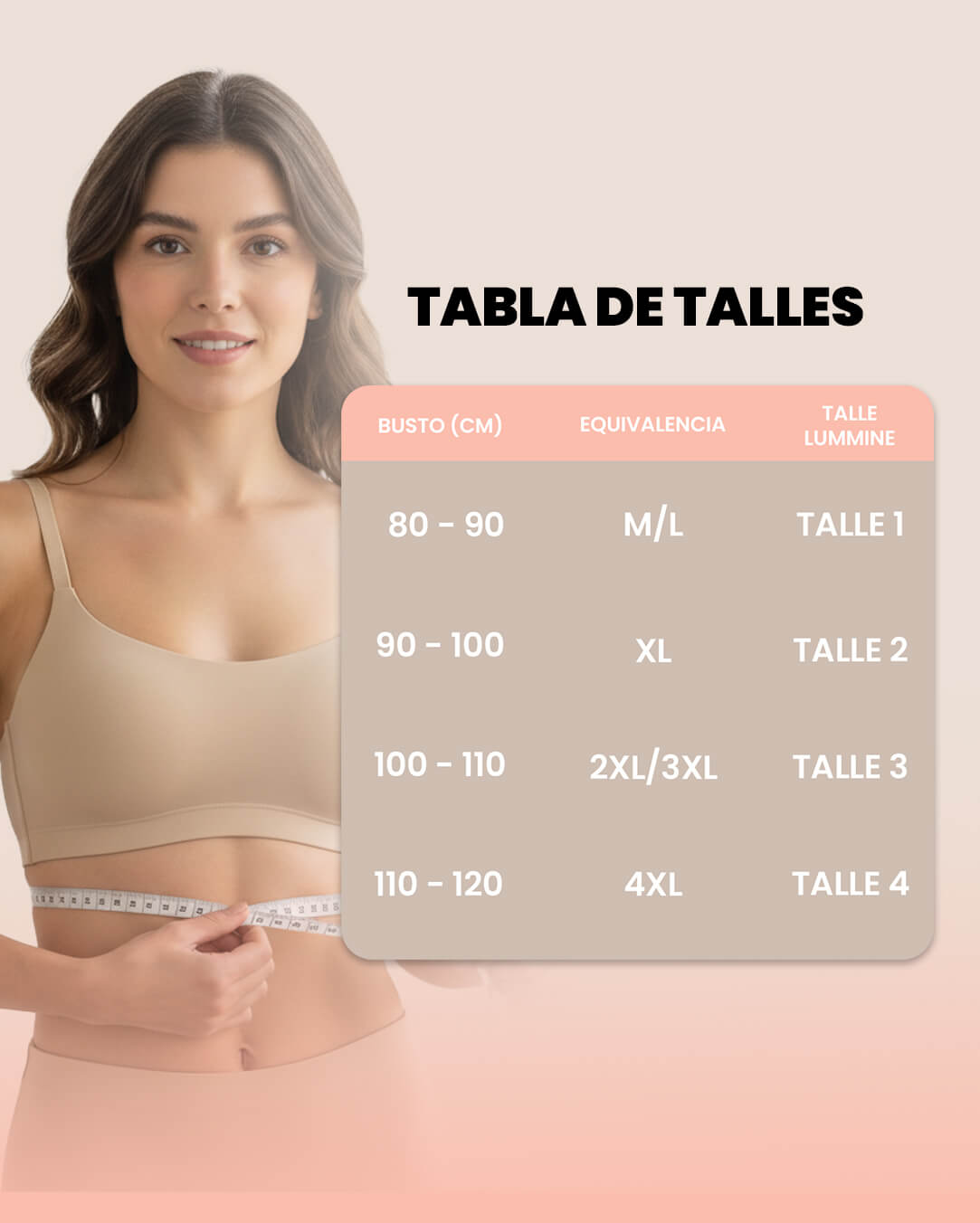 Medite el busto (contorno) con una cinta y buscá tu rango. Si estás entre dos talles, elegí el más cómodo.